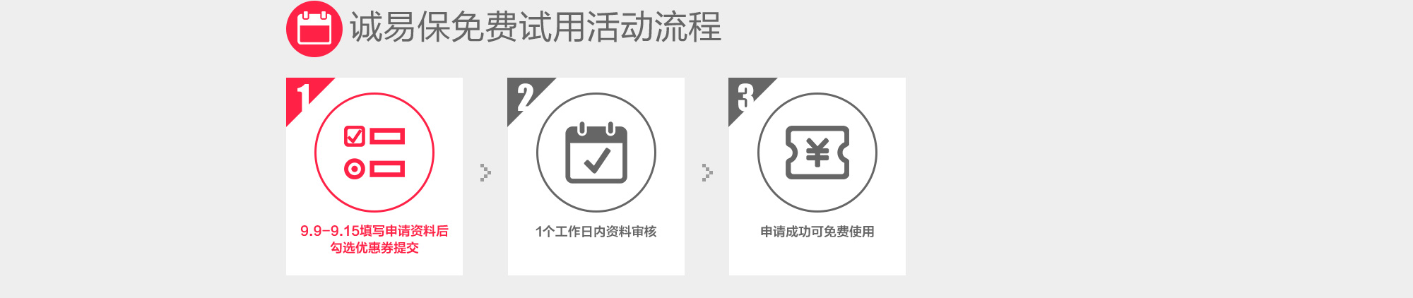 活动以发放免费试用券的形式进行,符合开通用户需在诚易保页面填写申请资料,提交时在当前页进行领取和使用免费试用券,最终进行提交资料审核,招行1个工作日内会进行完成审核(审核不通过则无法享受本次活动)