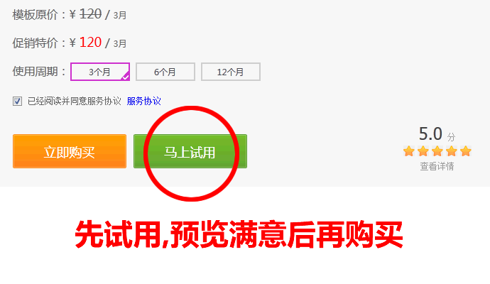 市场上的所有模版均免费试用,一般购买1年最优惠,如果不需要经常装修旺铺,建议直接购买1年。当然购买前需要先试用该模版。