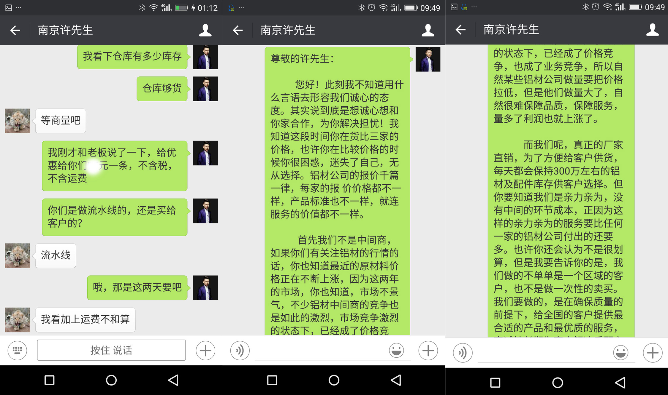 我和大家说个案例,这个月20号,山西的侯先生在阿里上找我咨询一种50*50的铝型材,问我型材的承重有多大。而我是怎样做呢,就是一步步去了解他的需求,以专业的知识和他去讨论。并告诉他你这个流水线应该用那种铝型材更合适,给他分析型材的承重力,如何去装配更方便。这个过程中,客户很少问到价格方面,因为他的注意力已经被我带到安装技术层面上去。