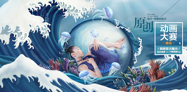 图中根据服装的颜色进行延展,运用卡通手法与实景的结合,别有一番风味。让浏览者耳目一新。图中的海水、海藻、水母、人物的层次是由近及远,画面冲击力非常的强,具有纵深感,远景近景层次分明。