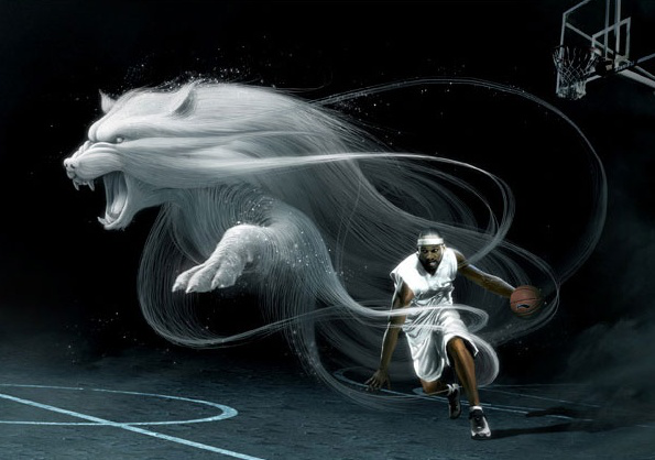 上图中通过烟雾缥缈的老虎来拉开运动员与投篮筐的层次,烟雾既弱化了投篮筐,同时突出了运动员,让两者有一个明显的层级关系。同时图中的运用手法也非常的有创意且巧妙,我们可以看出,运动员的进攻犹如狮子般的强势快速。深色背景加上白色烟雾狮子以及篮球运动员,画面层次感非常强且突出有创意。