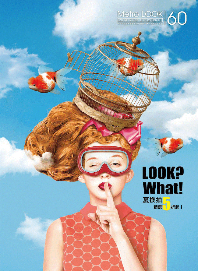 上图中运用了鸟笼、作为人的头饰,让人不约而同的抓住人的眼球,同时加上佩戴泳镜,更为有种俏皮的感觉,当然啦!有泳镜,那就不能少了鱼儿的衬托。鱼儿在鸟笼里,让人不约的对此产生兴趣。蓝天衬托,更能表达出鱼儿、鸟、大自然,渴望自由,渴望梦想,渴望突破的主题。