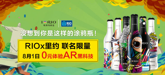 2016年8月的里约奥运会一度成为热搜TOP的话题,与里约同名的RIO怎么会放弃借势营销的机会?擅长娱乐的RIO在产品瓶身上做了创新,他们邀请四位里约艺术家绘制具有里约特色的场景,印制在瓶身上,推出了一款涂鸦限定瓶。