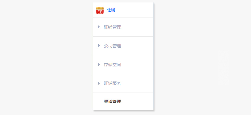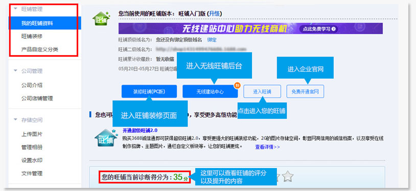 3"旺铺"后台包括"旺铺管理"、"公司管理"、"存储空间"、"旺铺服务"、"渠道管理"5个模块内容。