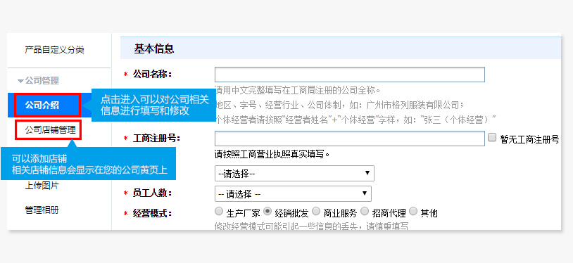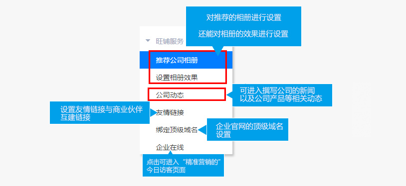 7旺铺服务中,可以对公司的相册、动态、友情链接做填充和修改。